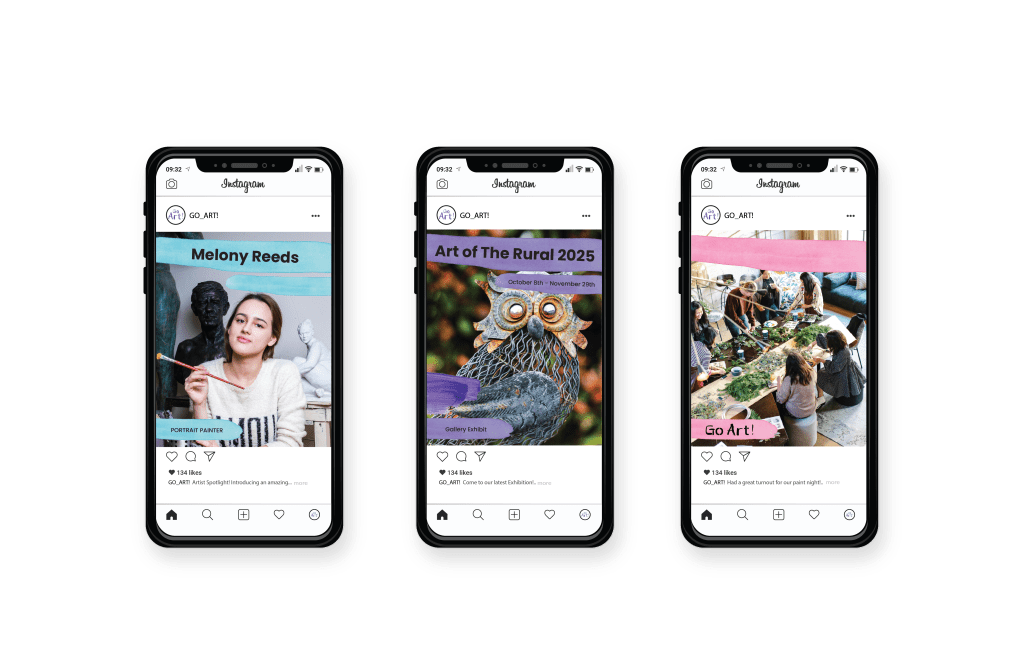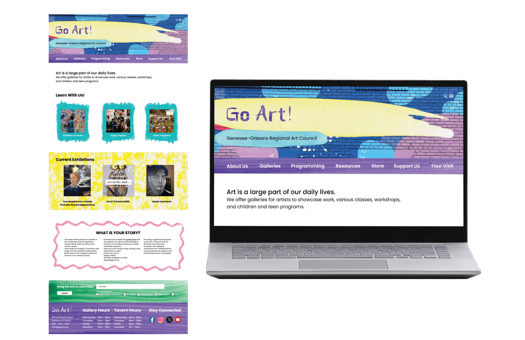 Go Art! is the art council of the Genesee-Orleans area of Rochester, NY. For my Design Systems class, I had to redesign their logo, website homepage, and one other of my choosing (social media).